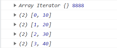 var arr = [10, 20, 30, 40]; console.log(arr.entries(), 8888); for (const v of arr.entries()) { console.log(v); }