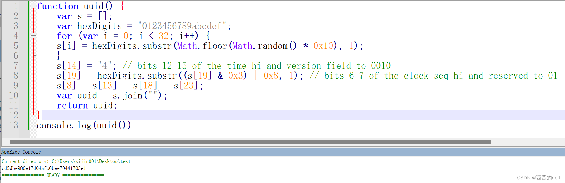 讯享网function uuid() { var s = []; var hexDigits = "0abcdef"; for (var i = 0; i < 36; i++) { s[i] = hexDigits.substr(Math.floor(Math.random() * 0x10), 1); } s[14] = "4"; // bits 12-15 of the time_hi_and_version field to 0010 s[19] = hexDigits.substr((s[19] & 0x3) | 0x8, 1); // bits 6-7 of the clock_seq_hi_and_reserved to 01 s[8] = s[13] = s[18] = s[23] = "-"; var uuid = s.join(""); return uuid; } console.log(uuid())