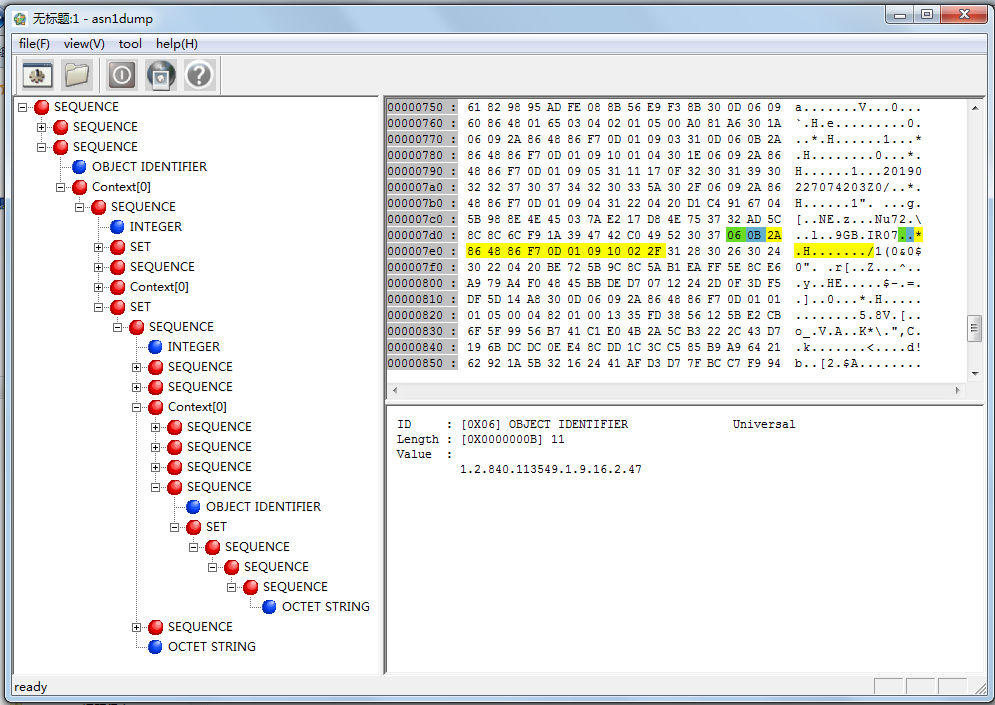 使用 ASN1View 工具软件,查看一个时间戳响应示例文件中 SigningCertificate 子项的 OID,如下图所示: