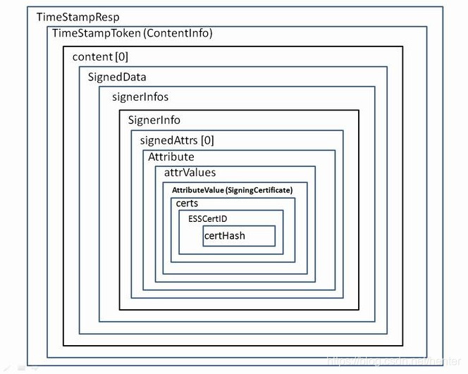 在 2001 年颁布的 RFC 3161 《时间戳协议》标准中,用到了 ESSCertID,它出现在时间戳响应的编码中。时间戳响应中只能包含一个签名,即 TSA 针对时间戳请求所做的签名。如果在发送时间戳请求 TimeStampReq 时,其中子项 certReq (它是 ASN.1 BOOLEAN 类型)的值设置为 true,与 TSA 签名私钥对应的签名证书必须被包含在时间戳响应中,并使用 ESSCertID 来指示这张签名证书。时间戳响应是一个非常复杂的结构,对于 ESSCertID, 它被嵌套包含的层次示意图如下: