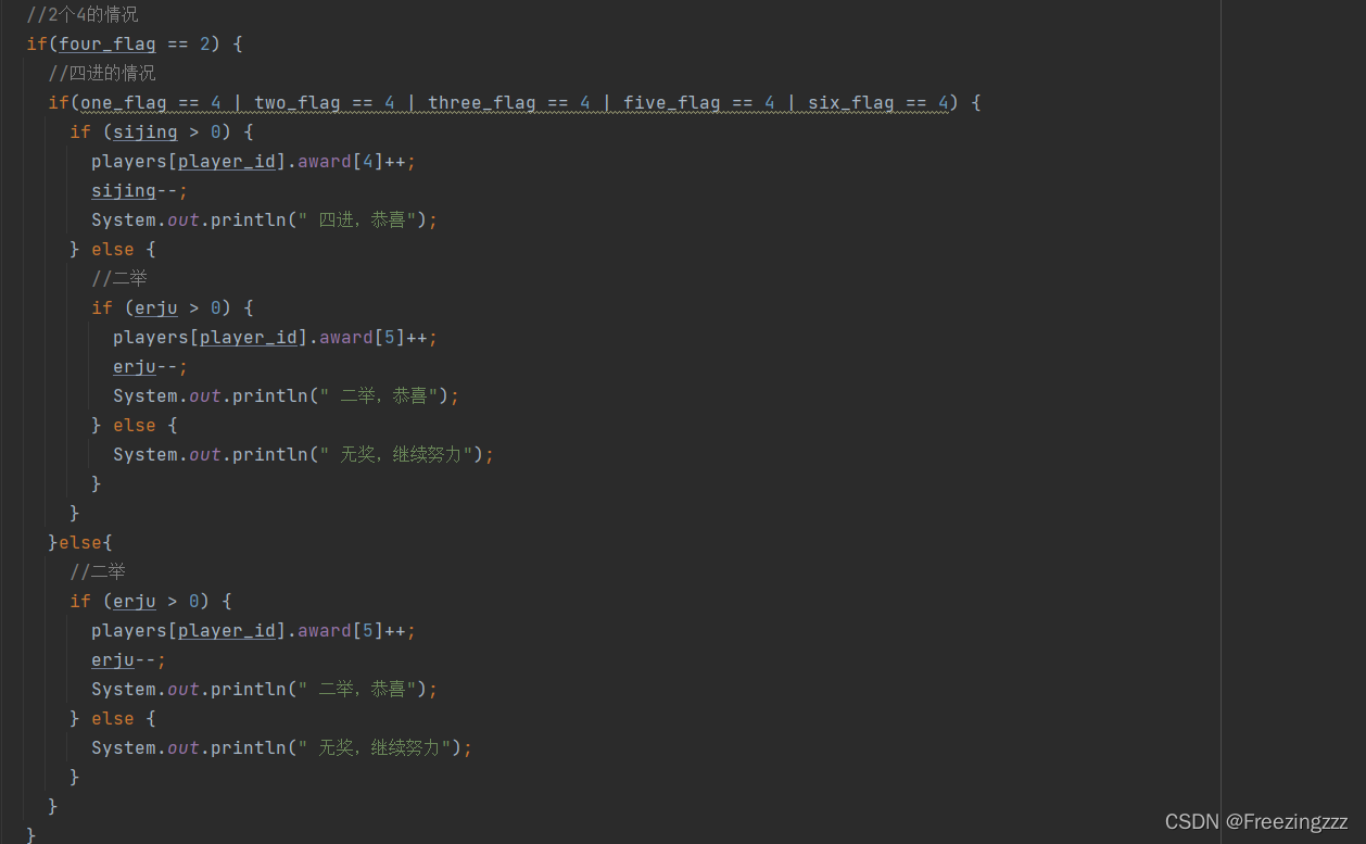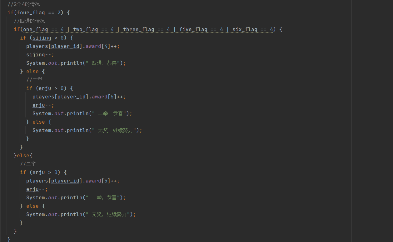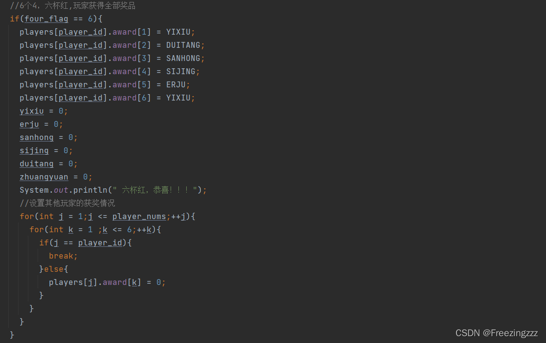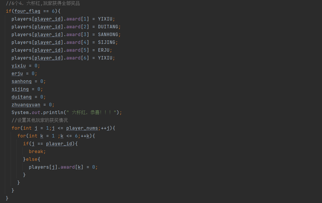第五步:用这6个flag去讨论获奖情况,因为游戏中有个特殊情况-----六杯红 该情况要单独拿出来讨论,我这里还用了常量YIXIU、DUITANG等常量去保留各个奖品数,当four_flag=6时,将全部奖品数归0,该玩家获得所有奖品数,对应的奖品数组全部赋值,并将其他玩家获得的奖品数全部归0