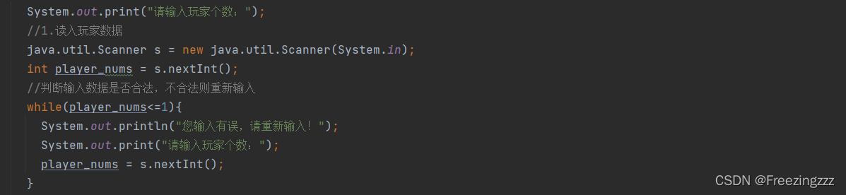 第一步:设置玩家数量,对不合法的输入值进行提醒,并让用户再次输入