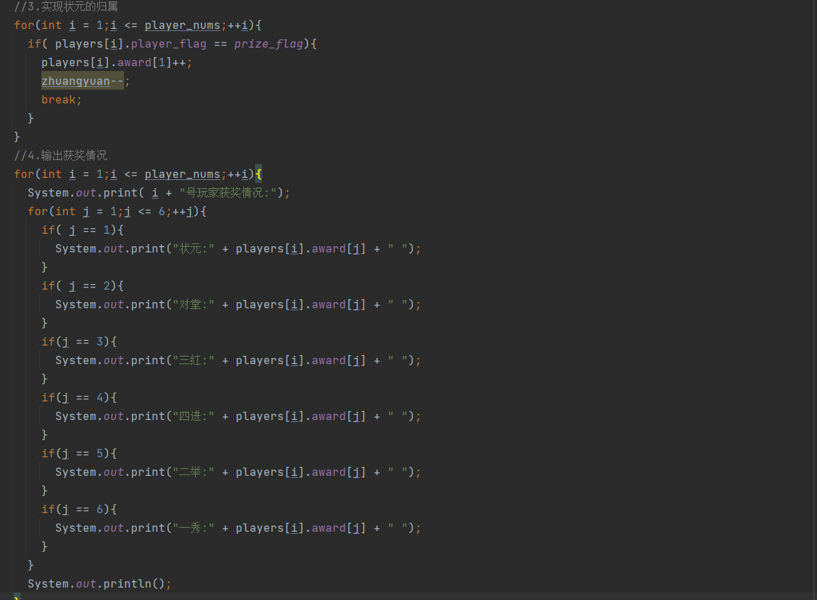 这样在最后输出所有玩家的获奖情况时,只需遍历所有玩家比较谁的player_flag等于prize_flag谁就获得状元奖品。