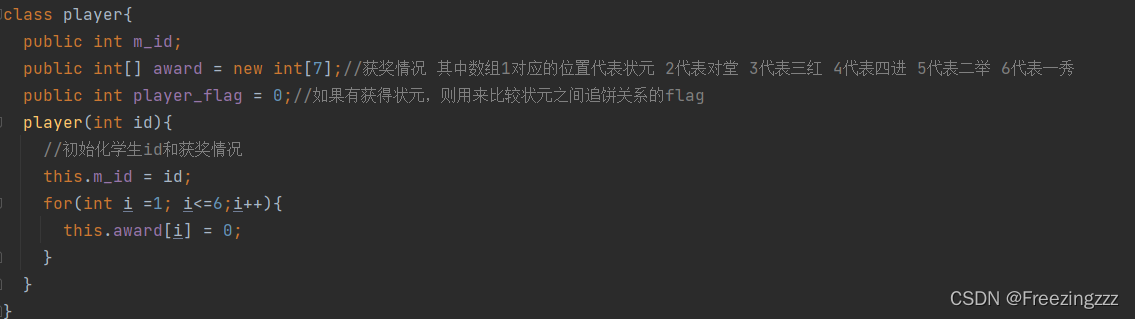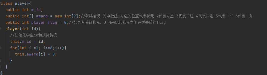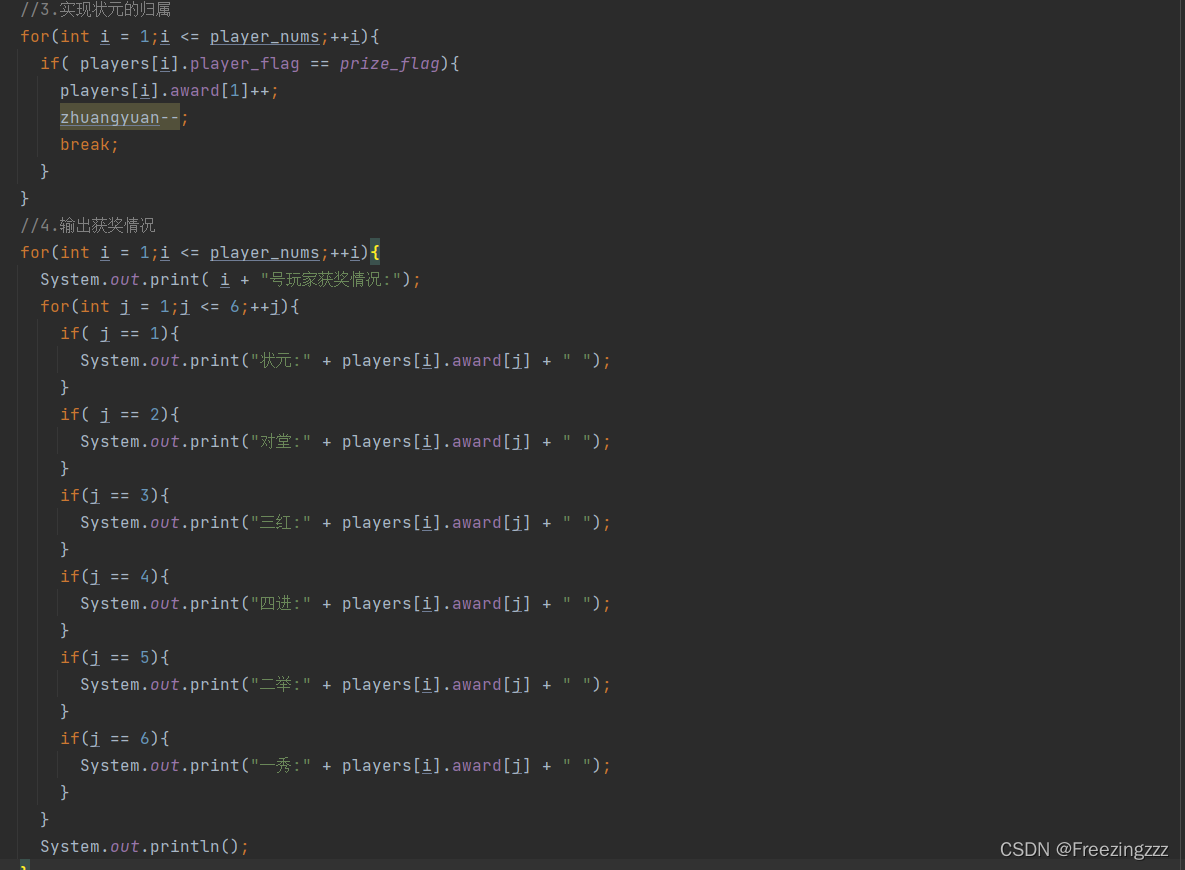 (1)用面向对象的思想,游戏的玩家可以封装成一个类,其中包含玩家的id、获奖情况以及用来比较状元之间追饼关系的flag。相关代码如下: