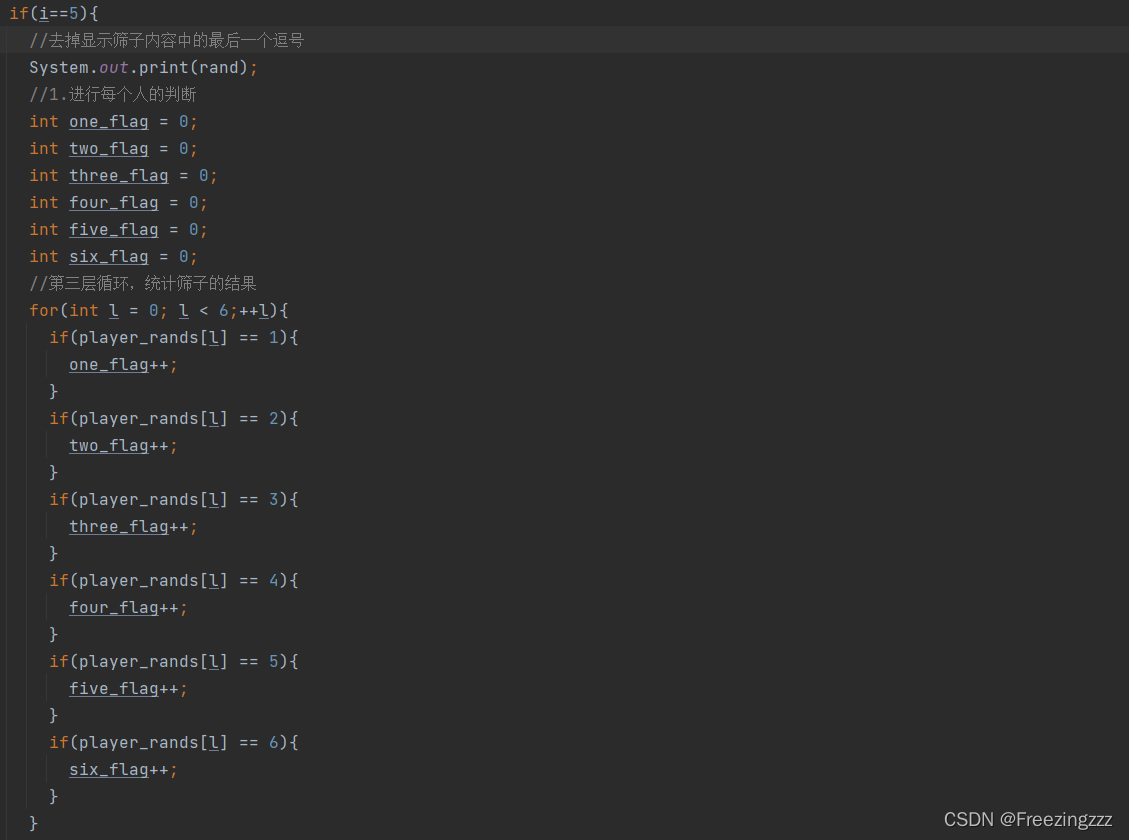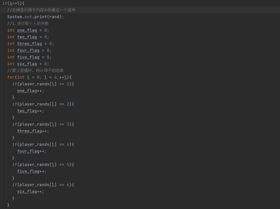 第四步:开始游戏,用随机数来模拟掷色子,并用一个数组去存储掷色子的结果,如果掷到第六个时则对该次循环对应的玩家所掷出的色子进行判断,判断他的获奖情况,并存储在对应的类数组中。当循环到第六次,此时循环体中i为5,此时对该玩家的所有属性进行更改,下图我使用了6个flag去对所掷出的6个色子进行数据保存,之后可以用这6个flag去判断该玩家的获奖情况,一次循环对应一个人的全部属性的改变,直到游戏结束