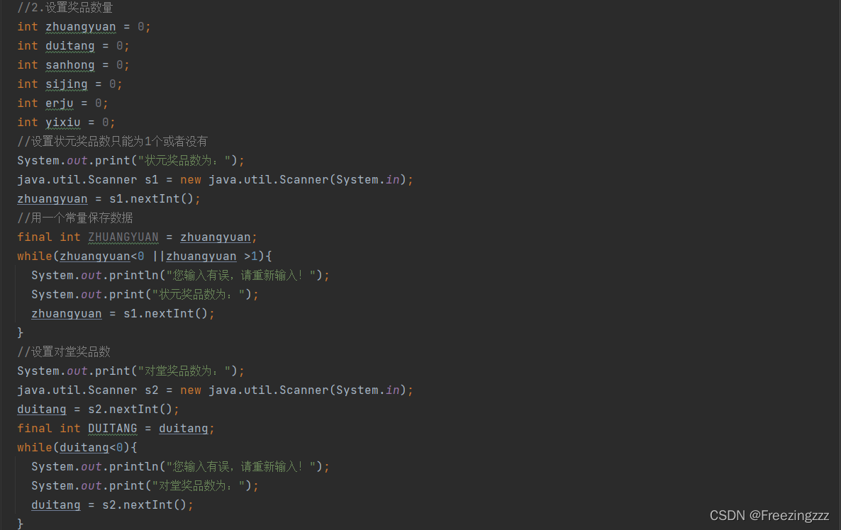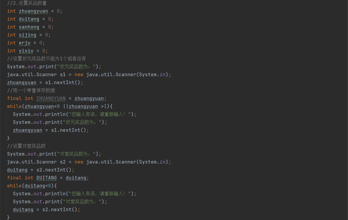 第二步:设置奖品数量,用6个变量去存储,然后让用户去输入奖品数,对不合法的值进行判断,这里只截取一部分代码