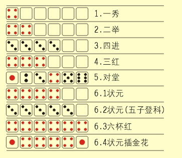 - 特殊情况: 若玩家掷出6个“四点”得“六杯红”,则直接夺得所有奖品。