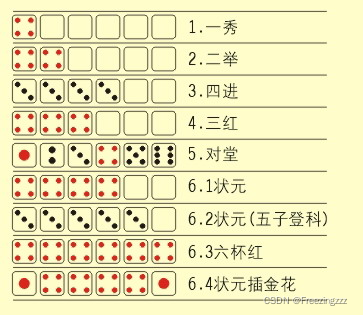 (1)游戏开始时,可由玩家设置奖品数,例如:设“状元”1个,“对堂”2个,“三红”4个,“四进”8个,“二举”16个,“一秀”32个。
