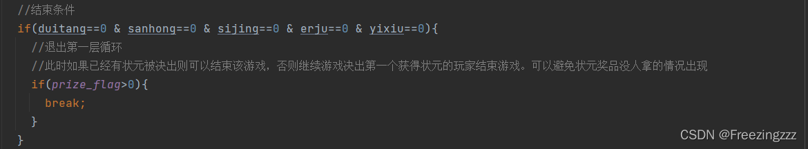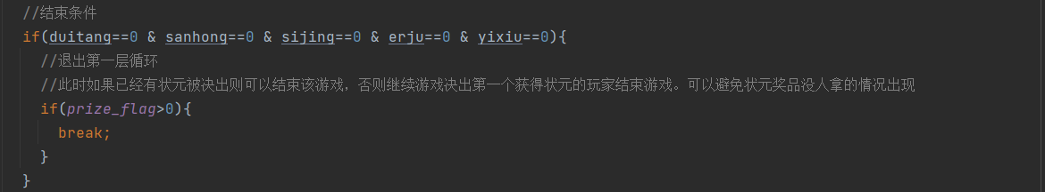 第七步:对游戏结束条件的编写和全部情况的逻辑编写-------这里要设置一个条件,不能无限追饼,这样游戏就没有意义,所以要在除了状元外的所有奖品都被人拿走后而且状元已经被决出来的情况直接结束游戏,若状元还未有人抽中,则继续游戏直到一名玩家抽中状元,并且此时结束游戏