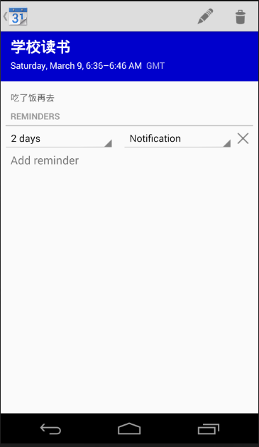 CalendarReminderUtils.addCalendarEvent(this,"学校读书","吃了饭再去",System.currentTimeMillis()+3600*24*1000*2+10000,2);