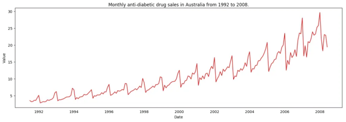# Time series data source: fpp pacakge in R. import matplotlib.pyplot as plt df = pd.read_csv('https://raw.githubusercontent.com/selva86/datasets/master/a10.csv', parse_dates=['date'], index_col='date') # Draw Plot def plot_df(df, x, y, title="", xlabel='Date', ylabel='Value', dpi=100): plt.figure(figsize=(16,5), dpi=dpi) plt.plot(x, y, color='tab:red') plt.gca().set(title=title, xlabel=xlabel, ylabel=ylabel) plt.show() plot_df(df, x=df.index, y=df.value, title='Monthly anti-diabetic drug sales in Australia from 1992 to 2008.')