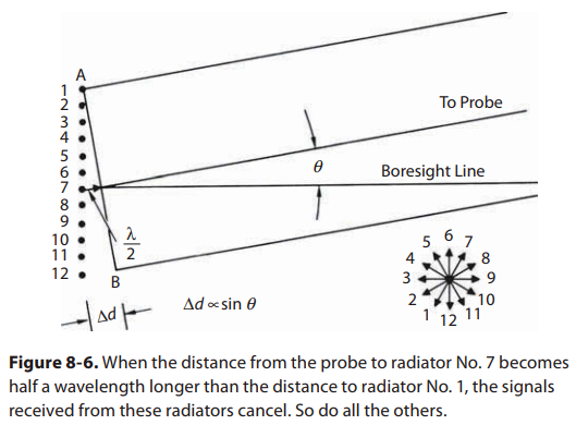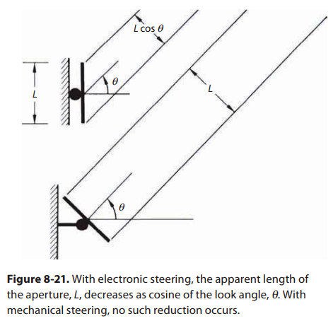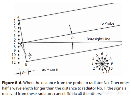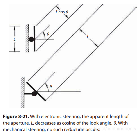 接着引入电扫雷达,也就是相控阵雷达的概念,相控阵雷达的原理和图8-6中的原理是一样的,每个辐射单元的相位可调整,通过调整每个辐射单元的相位使空间中某个方向的相位一致,得到最大增益,从而实现波束角度的调整。相控阵雷达比机扫雷达的优点多很多,大家可以自行百度。这里说下相控阵不如机扫雷达的一个地方,如下图所示。