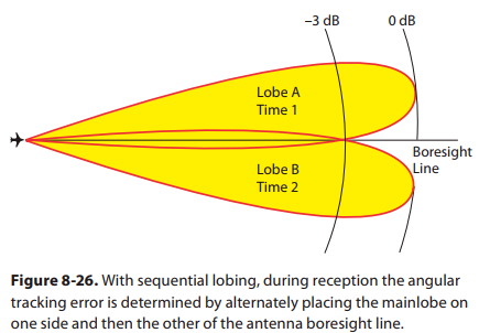 角跟踪的原理简单来说,就如图8-26,当目标处于瞄准线(bore sight line)时,误差为0,当偏离以后误差不为0,根据误差值的大小和正负调整波束指向就可实现角跟踪。注意波瓣的相交点位于-3dB线。