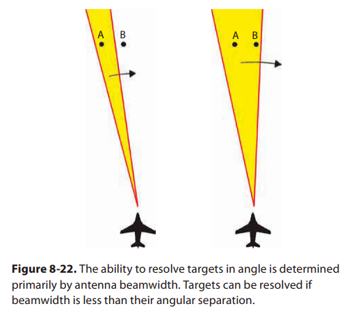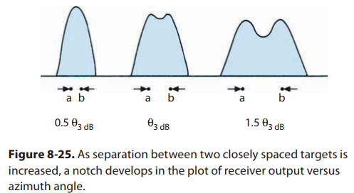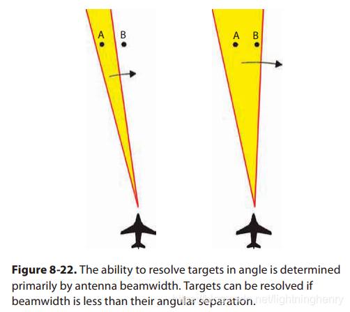 图8-22中,雷达波从左往右扫描,左侧雷达波束比较窄时,A和B不会同时处于雷达波的照射中,可以容易的区分出是两个目标,右侧雷达波束变宽,A、B同时处于雷达波的照射中就不好区分了。