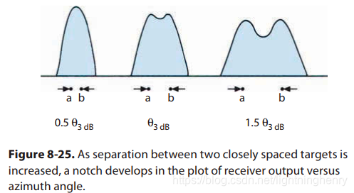 图8-25中,雷达波束宽度不变,目标a和b的距离逐渐增大,当a和b间隔1.5倍,3dB波束宽度时,目标a和b可以区分开来,所以雷达的角分辨率可以用3dB波束宽度来衡量。当然随着技术的进步,雷达现在的角分辨率肯定小于3dB波束宽度。