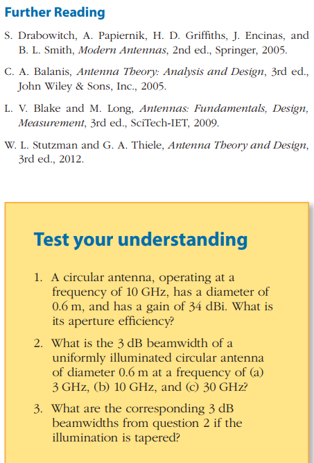 2. 直径0.6米,频率分别为(a)(b)(c)的均匀照明圆形天线的3dB波束宽度是多少? (a)3GHz; (b)10GHz; (c)30GHz