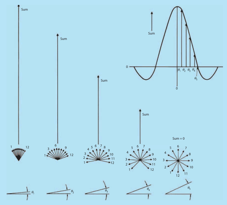 中间这条大的是我们想要的雷达波,旁边长的像花瓣一样的波,我们把它叫旁瓣,是不是很直接。。为什么波是一瓣一瓣的呢?这里放两张图,随着θ的变化,向量的和的幅值呈辛克函数变化。