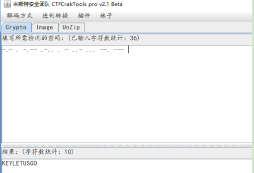 将音频听到的声音,按照摩斯电码的规律记录下来“-.- . -.-- .-.. . - ..- ... --. --- ”,用CTFCrackTools工具进行转换得到一串字符“KEYLETUSGO”