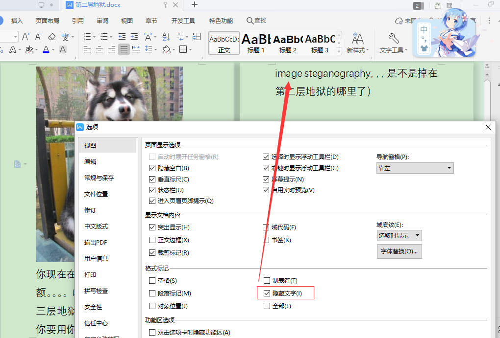 文件--》选项---》隐藏文字的勾 勾上 出来了 steganography