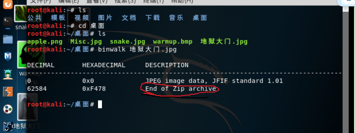 通过里面的文字说明可以知道这个文档是那张图片所需要的秘钥,而文档理由提出按二进制数字,将其8个一组进行转换ASCII码,得到“ruokouling”,翻译成中文就是“弱口令”,好吧,这个的意思要么这个拼音是图片的秘钥,要么就是图片的解密需要弱口令,而需要弱口令的通常是爆破的时候,也就是说这张图片可能隐藏了一个压缩文件,所以用kali里的binwalk工具查看