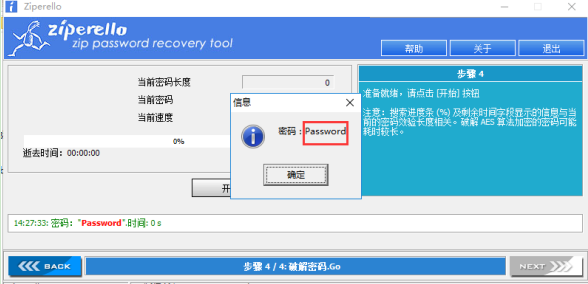 通过之前的解密得到的提示,需要使用弱口令,所以打开工具Ziperello,进行弱口令字典爆破得出密码:(需要一个好的字典)