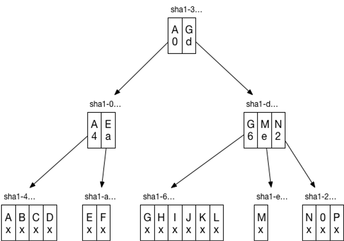 Prolly Tree 全称是Probabilistic Merkle B-Trees,集成了B树和merkle 树,结构示例如下:
