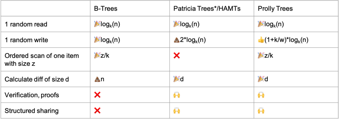 因此,prolly tree 具有B树高效随机读写和有序扫描的特性,同时拥有merkle 树的可验证性以及包括/排除的可证明性,具体的属性如下表所示: