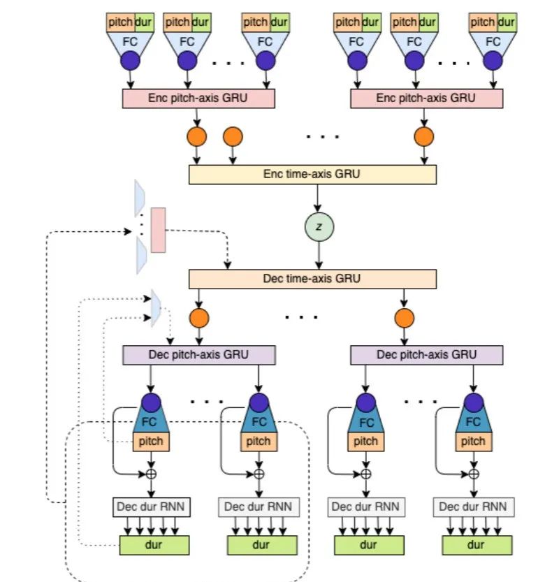 再以一个Encoder-Decoder网络来学习复调音乐的latent representation,整体模型架构如下: