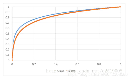 A-law和u-law画在同一个坐标轴中就能发现A-law在低强度信号下,精度要稍微高一些。