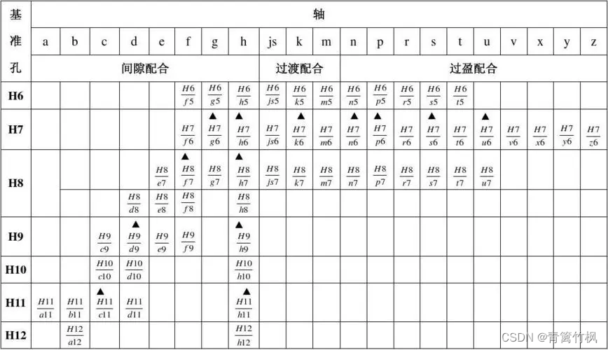 如图采用基孔制,孔的公差代号为H,公差等级如果选择为IT7,那么轴的公差等级就要比孔高一级,选择IT6, 若选择间隙配合,可以选用下表中的优先配合公差等级H7/g6