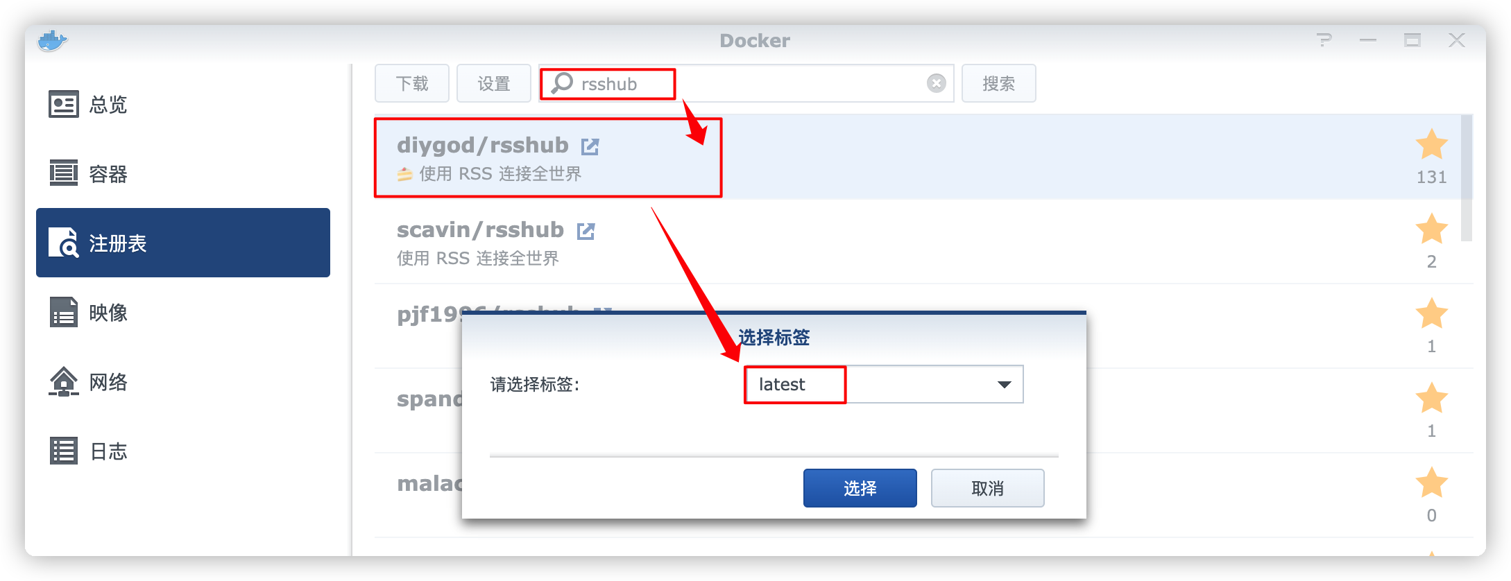 在注册表中搜索 rsshub ,选择第一个 diygod/rsshub,版本包括 latest 和 chromium-bundled 两个