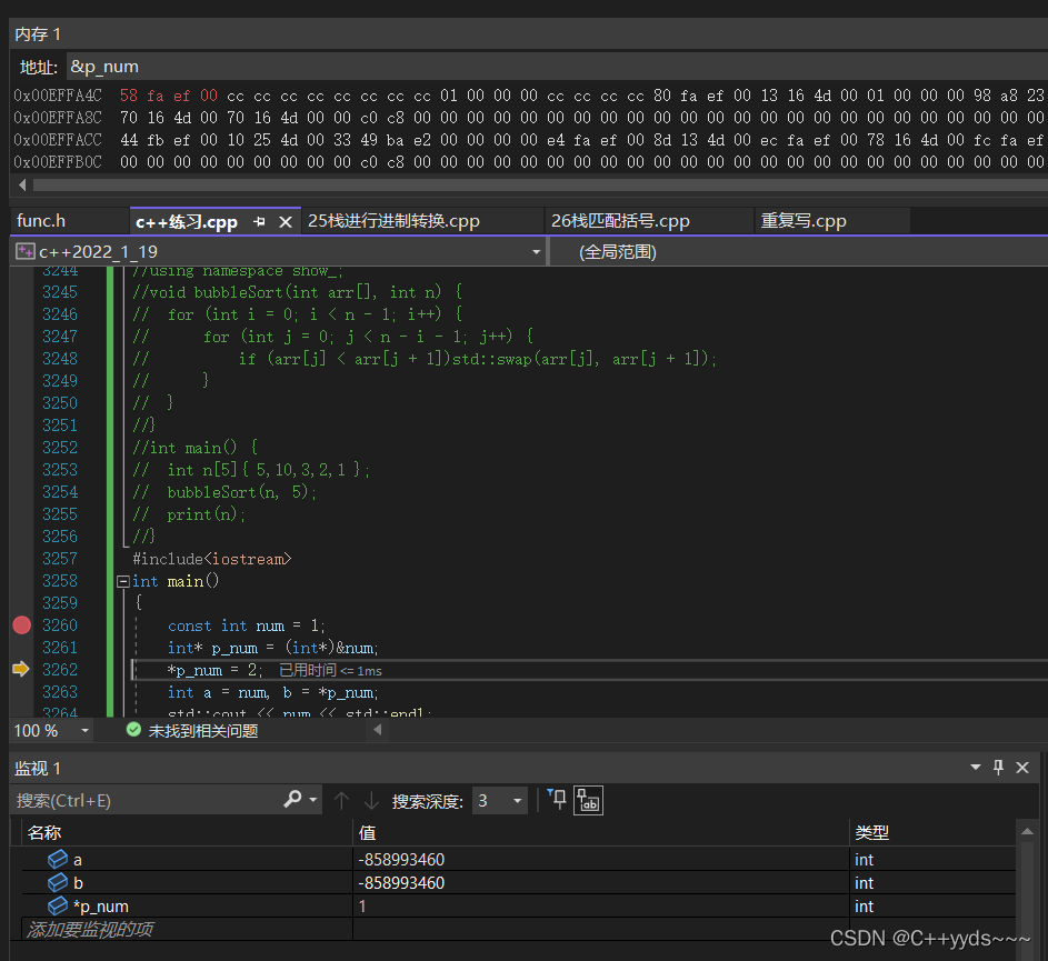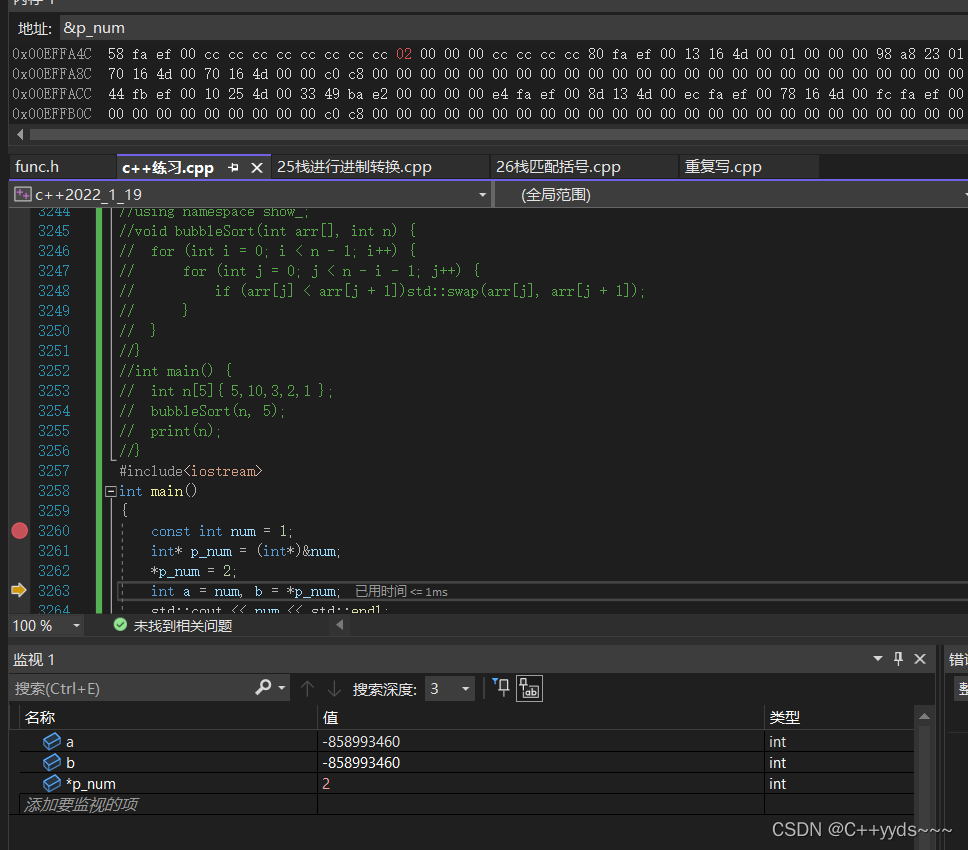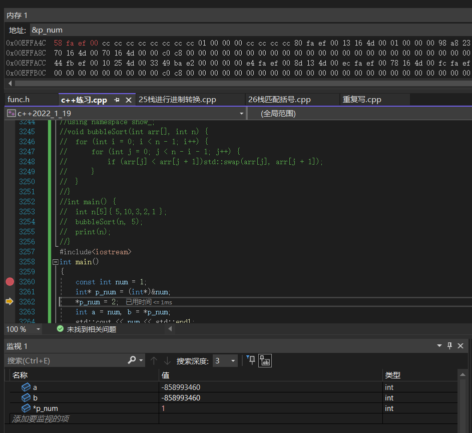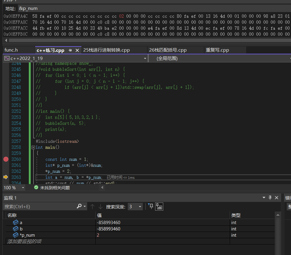 2、间接修改,编译器会对这种行为做优化,编译器会无视你对常量间接修改的操作,也不会中断报错,这个时候看图,指针指向了常量的num,解引用就是1,这个注意看上面内存&p_num,此时的指针地址,第二图指针的地址,发现了吗,指针的地址变了,或许不该这么说,这是指针自身的地址,它变了表示着,此指针非彼指针,编译器的优化是,既然你想要给常量赋值2,修改它,我肯定是不允许的,但是我可以让你满足你的指针指向的是2,编译器直接替换了一个新的指针,这也是为什么指针自身的地址变了,表示着这是编译器开辟了一块内存,内存的值是2,把这块内存的地址作为了p_num,所以最好常量还是1,b被赋值为*p_num也就是地址*取值为2,,b变成了2.