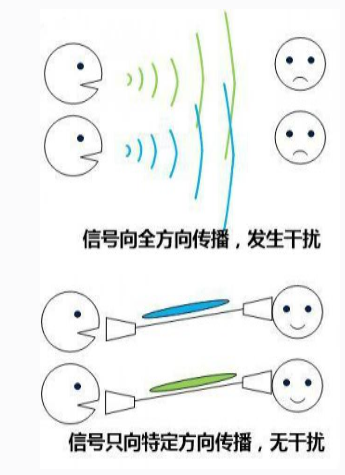 很显然,在这种情况下会发生互相干扰。这是因为信号会向着四面八方传播,所以一个人会听到多个人说话的声音从而无法有效通讯。但是,如果我们让每个说话的人都用传声筒,让声音只在特定方向传播,这样便不会互相干扰了。