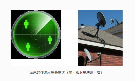 另一个例子是卫星通讯,也即我们生活中常见用于卫星电视的“锅盖天线”。卫星和地面接收天线的距离非常远,信号衰减非常大,于是卫星信号到达地面时能量已经非常小。因此,我们需要想方设法收取卫星发出的每一点信号能量。当卫星的信号向空间全方向辐射时,绝大多数能量并没有被地面天线接收到,而是被浪费了。为了避免这种浪费,我们在接收和发射卫星信号时,都会使用波束。这样,发射的电磁波信号都集中在一个方向上,只要接收天线能对准这个方向,就可以接收到尽可能多的信号。