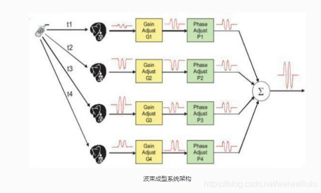 在波束成形中,我们有许多个波源(即天线阵列),通过仔细控制波源发射的波之间的相对延时和幅度我们可以做到电磁波辐射的能量都集中在一个方向上(即接收机所在的位置),而在其他地方电磁波辐射能量很小(即减少了对其他接收机的干扰)。