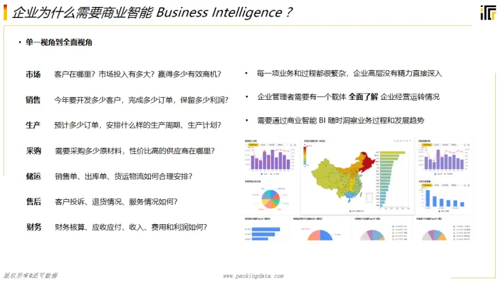 对于企业来说, BI 的功能非常丰富,可以有效解决企业在处理数据相关流程时遇到的问题。当然除了各种功能模块, BI 主要负责实现业务流程和业务数据的规范化、流程化、标准化,打通ERP、OA、CRM等不同业务信息系统,整合归纳企业数据,利用数据可视化满足企业不同人群对数据查询、分析和探索的需求,从而为管理和业务提供数据依据和决策支持。