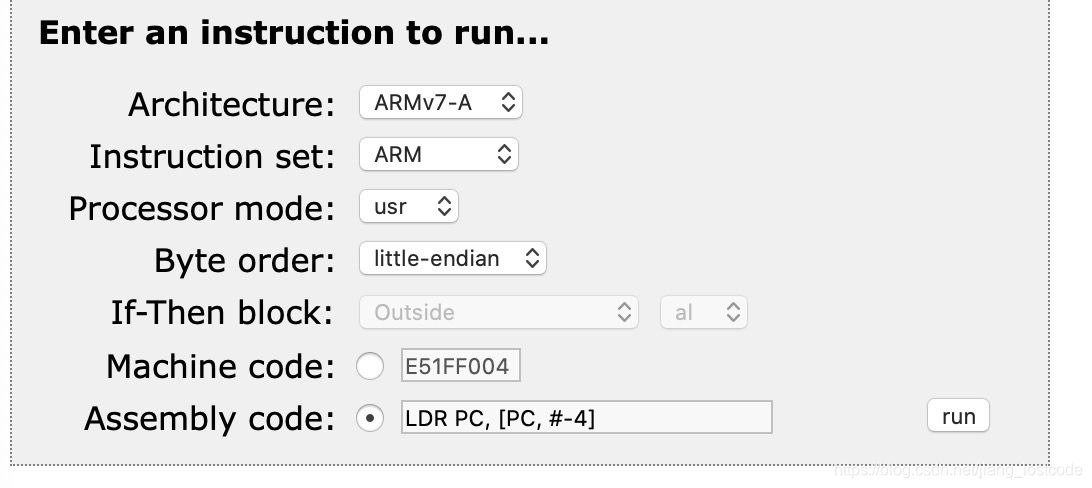 1、首先将LDR PC, [PC, #-4]这条指令转化为16进制的机器码,这里推荐一个网站,可以提供arm指令和十六进制机器码之间的转换:http://svr-acjf3-armie.cl.cam.ac.uk/main.cgi,如图: