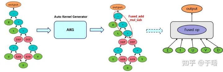 如下图所示,是海洋模式中求解正压模态的海表高度方程的图算融合过程。首先,MindSpore会将用户的实现代码转换为对应的计算图,用户的输入和计算过程对应计算图中的每个节点。然后未使能图算融合的原始计算图输入到AKG(Auto Kernel Generator, 自动算子生成)模块,AKG会对输入的计算图进行扫描,自动生成对应的融合算子,减少中间变量的产生,增加指令集发射长度,提高计算效率。当前MindSpore可以自动的对add、sub、mul、div这些ElementWise算子进行融合,无需用户进行额外的操作。而我们的最终目标是将自定义的差分算子与基础算子进行更大范围的融合,最终融合成一个完整的算子。这样对于每一个求解方程来说,都是一个融合算子,没有额外的中间计算结果产生,能够极大的提升性能。