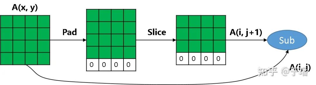 借鉴OpenArray的思想,我们在MindSpore中进行类似的算子抽象。以DYF算子为例,使用Pad、Slice算子组合实现DYF运算,如下图所示。首先对输入的A(x, y)的y轴向后扩充一维,用Pad填充为0;再使用Slice算子将y轴第一维移除,这样得到的A’(x, y)中的每个元素与原始输入中的A(i, j+1)一一对应。最后使用A’(x, y)减去A(x, y)就得到了DYF算子的运算结果。