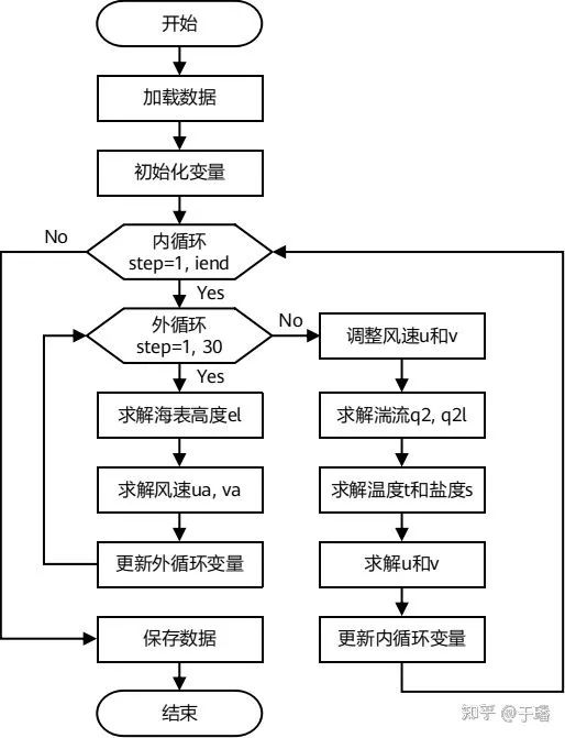 GOMO模型基于动量、能量和质量守恒定律,推导微分方程组和边界条件,确定需要求解的7个方程组,详细的公式推导参考论文。图1是GOMO的整体执行流程图。首先,从Seamount数据中加载数据,用于模型中变量的初始化。加载初始值和模型参数后,计算分为内模态循环和外模态循环两个部分。在外模态循环中,主要计算二维海表面高度el和二维平均风速ua、va。在内模态循环中,循环次数iend是训练的总时间步数(由用户输入设定),内模态循环的计算三维数组占主导地位,依次计算湍流动能q2和产生湍流动能的湍流长度q2l、温度t和盐度s、x和y方向的风速u和v。计算完成之后,保存所需的变量结果,结束训练。
