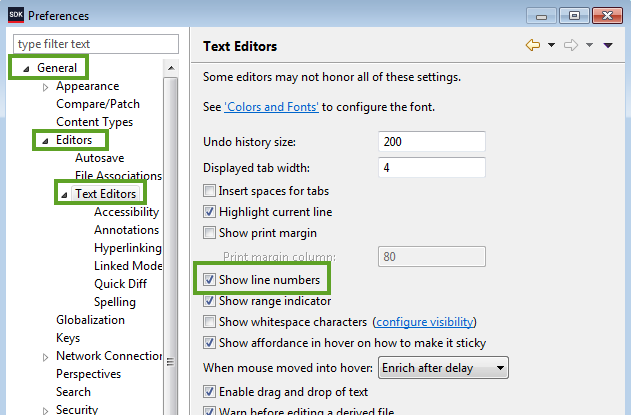 里面提到在SDK中显示代码行数,在这记录一下:Window——>Preferences dialog——> General——>Editors——>Text Editors——>选择Show line numbers即可。
