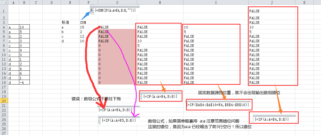 - 特别注意,如果简单粗暴用 a:a 而不用 a4:a16 有错位问题,因为a:a 包含了列里的其他行元素,不只你看到的a4:a16