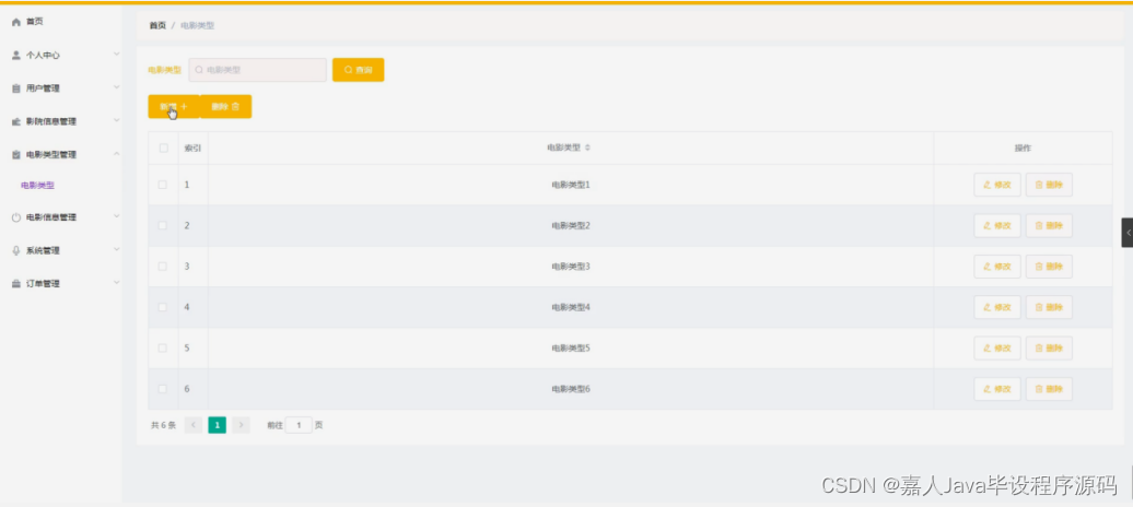 管理员登陆系统后,可以对首页、个人中心、用户管理、影院信息管理、电影类型管理、电影信息管理、系统管理、订单管理等功能模块进行相应操作,如图5-10所示。
