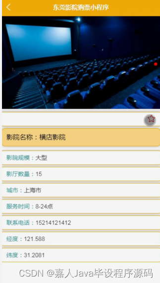 影院信息,在影院信息页面可以查看影院名称、影院规模、影院图片、影厅数量、城市、服务时间、联系电话、经度、纬度、地址等信息,如图5-4所示。