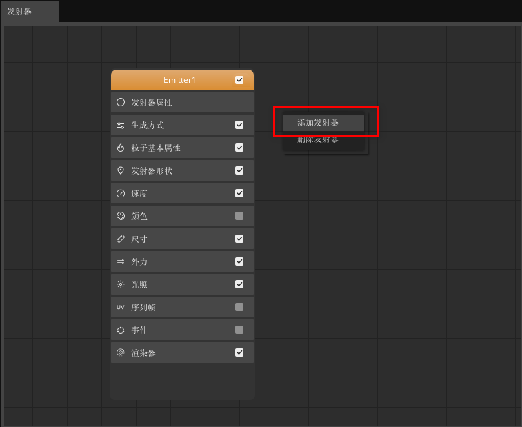 首先我们在“发射器”窗口中鼠标右击,点击“添加发射器”添加一个新的发射器。