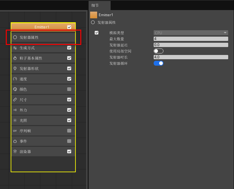点击发射器节点中的“发射器属性”属性分类后,您可在“细节”面板查看该属性分类下的属性模块,按照下图设置粒子最大发射数量和发射器时长。