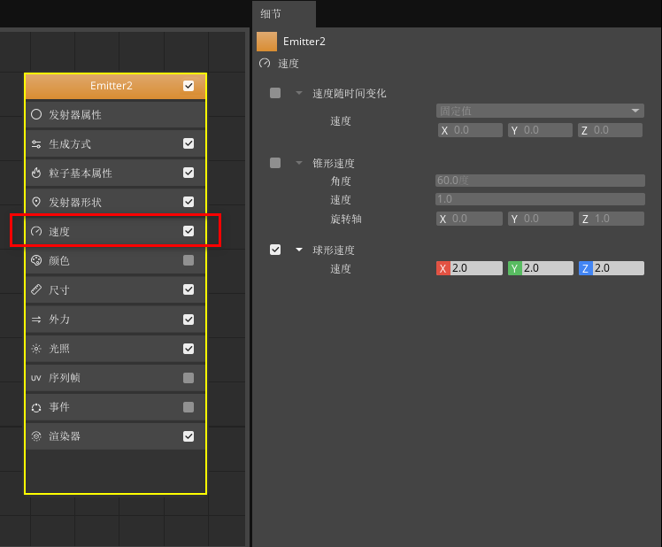 点击发射器节点中的“速度”属性分类后,按照下图设置速度参数。
