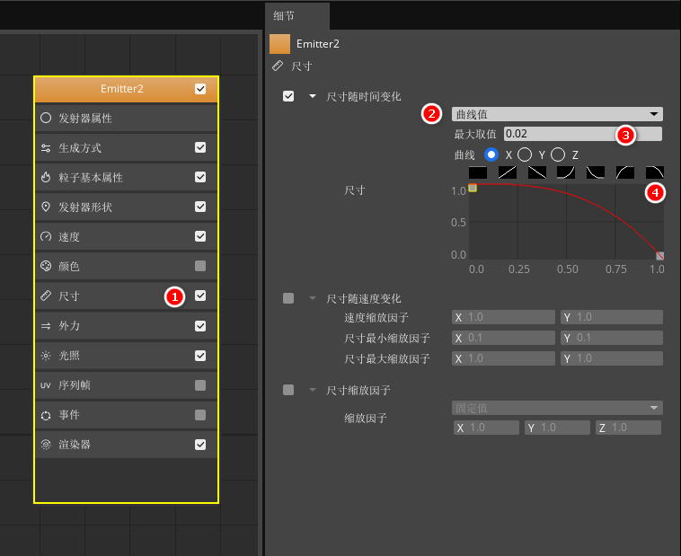 点击发射器节点中的“尺寸”属性分类,勾选“尺寸随时间变化”,选择类型为曲线值,并按照下图设置X、Y、Z的最大值和曲线。