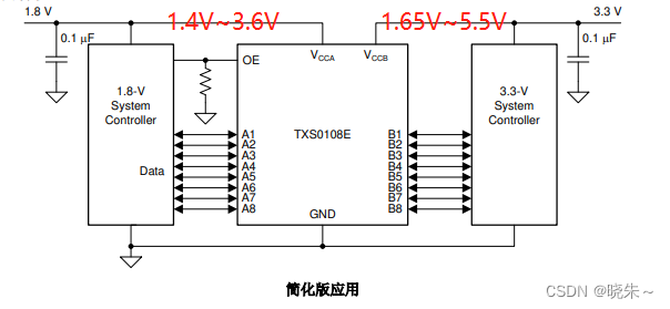 一般项目上,使用MOS管方案即可满足要求,但在一些高速通讯的场合,就需要用到专用的电平转换芯片。用法比较简单,如TI的TXS0108E系列的电平转换芯片,其应用电路如下: