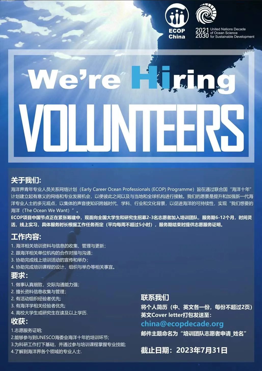 联合国海洋十年计划之海洋届青年专业人员关系网络计划(Early Career Ocean Professionals,ECOP)中国节点正在筹备中,需要招募实习生与志愿者,感兴趣的小伙伴可以查阅以下两个招聘信息。